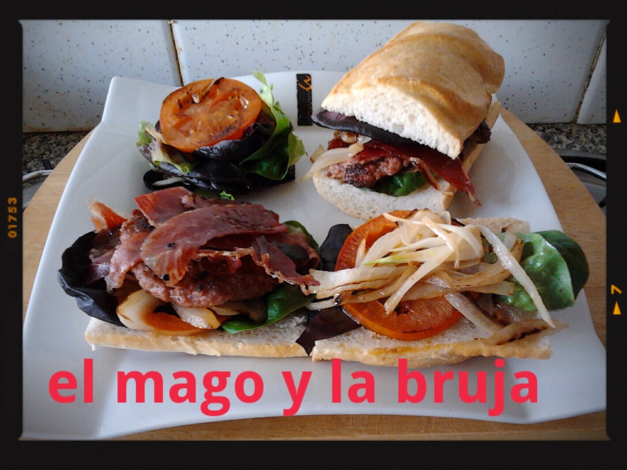 En una parrilla echamos un poco de aceite colocamos jamon vuelta y vuelta,en la misma parrilla asamos hamburguesas,tomate a rodajas y cebolla ,montamos bocata,lechuga,tomate cebolla,jamon,hamburguesa y jamon ,rehogamos con un poco de aceite o salsa al gusto.